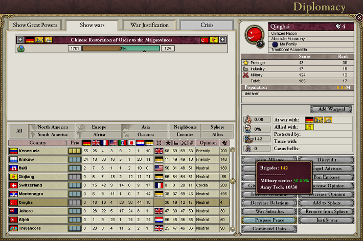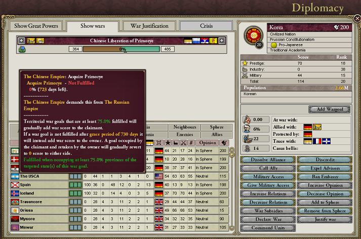 中国は文明化したてだから、陸軍技術は第1世代じゃないかな。ロシアは最低でも第3世代。この程度の戦力差では中国が戦闘で勝てっこないだろうね。それに、この手の領土紛争だとWarScoreは50もいらないから、戦闘のスコアだけで相手を屈服させることは可能。