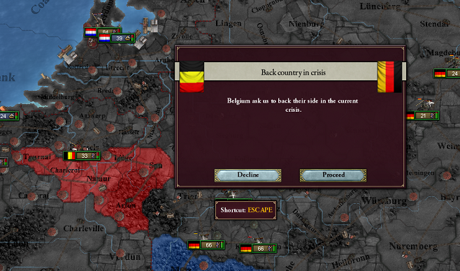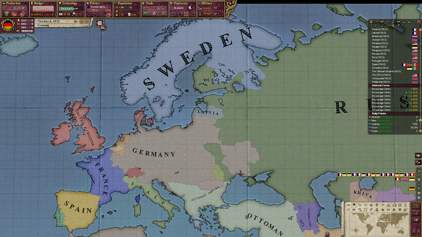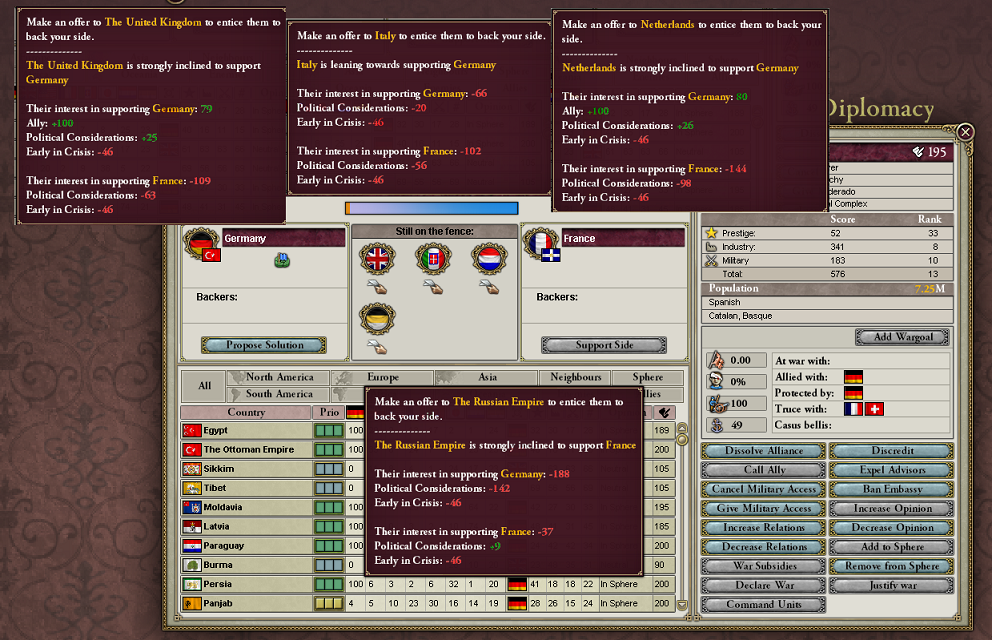 スペイン方面は全然ダメだな。ドイツ方面はこっちが完全に優勢。スペインがもう一つのバレンシアもAddWargoalしてくれればいいんだけどな。スペインの国力もあるし、あんまり長引かせられない……。
