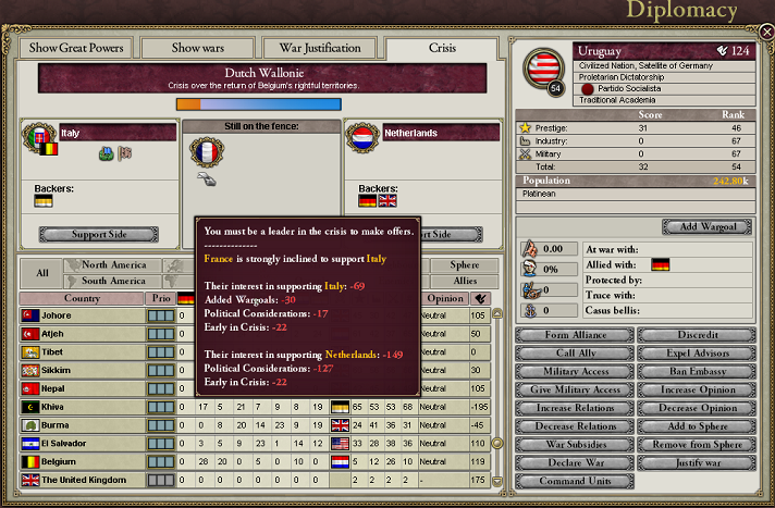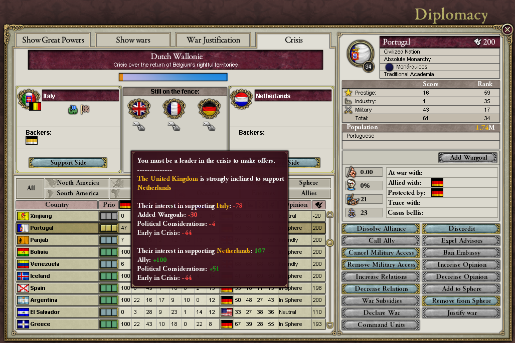 戦ってもいいけど、危機はダメ。戦うならイギリス・オランダ連合対ドイツとどっかの列強(日本)での大戦だね。フランスとロシアとの和平期間中にやらないと、個別に宣戦布告されるよ。列強の全面包囲ではさすがのグレーター・ドイツとてボコられると思う。まぁイギリスなんぞは海戦で海軍ボコれば本土を塗り絵していくだけだし、なんてことない。インド軍が怖いね。