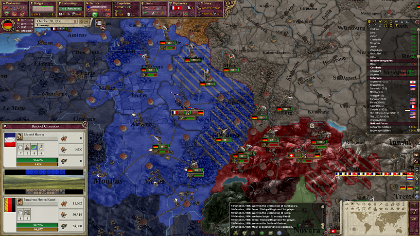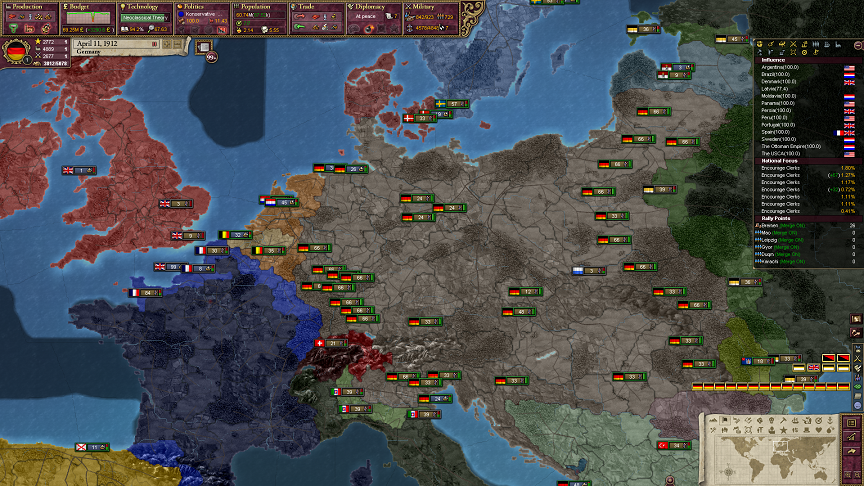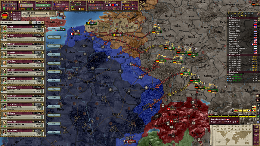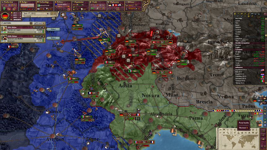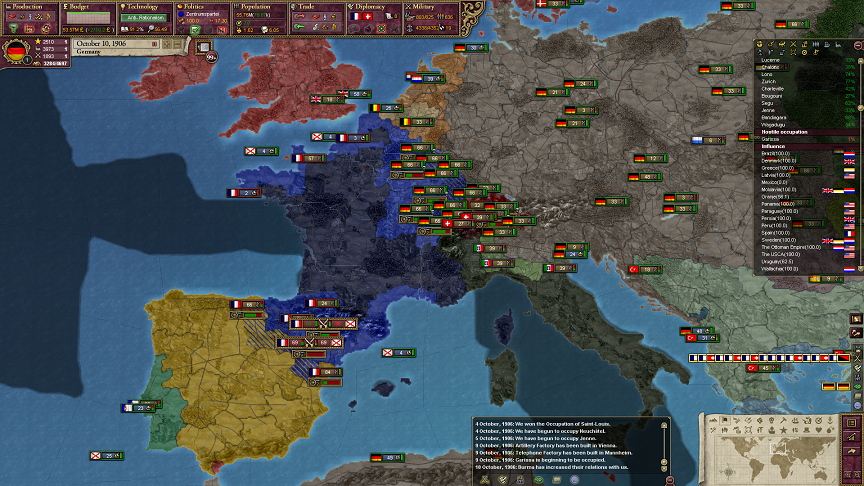 このゲームではスイスは基本的にフランスの衛星国だねえ。ドイツとイタリアはスイスのことが大嫌いかもしれん。