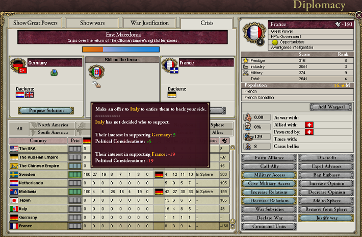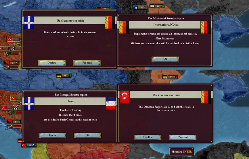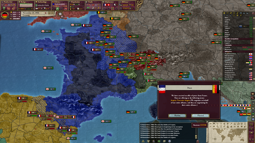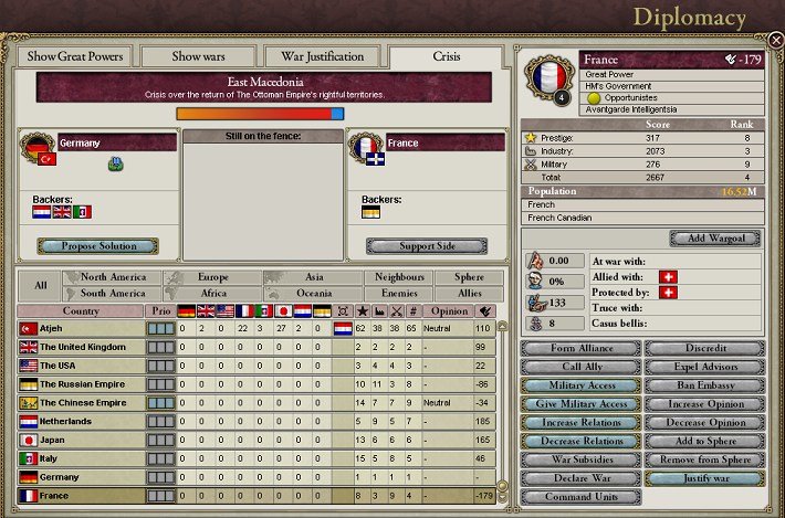 ゲームシステム的に危機のバックオファーがどういう手順でやられるかわからないけど、ある側のオファーが成否にかかわらず完了するまでは次の側のオファーは行われないみたいなんだ。だから、今回はフランスがついたんだけど、イギリスがついたんだったら、オスマン帝国側のオファーも断って、ギリシャ側について白紙和平にしたね。