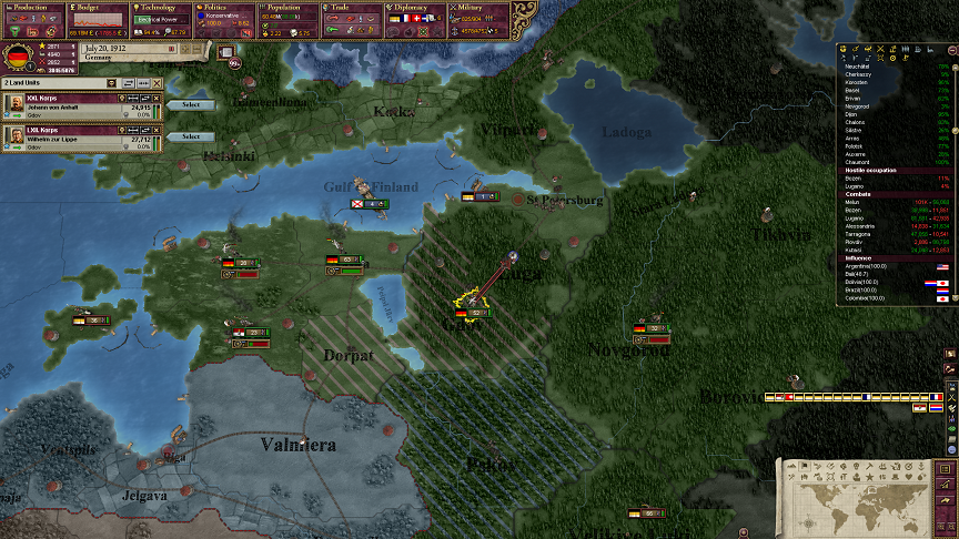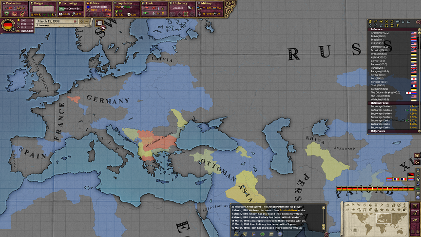 世界市場に戦車をつくる材料が少ないとユニットがなかなかつくれないし、軍が大規模であればあるほど、それに見合う量の戦車を用意できない。だから、いくつかの軍団を機械化して終わり。戦車は強いけど圧倒的ってわけではないから、結局歩兵と砲兵でいいよねってなるわけ。
