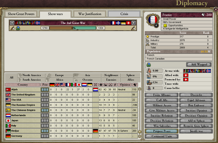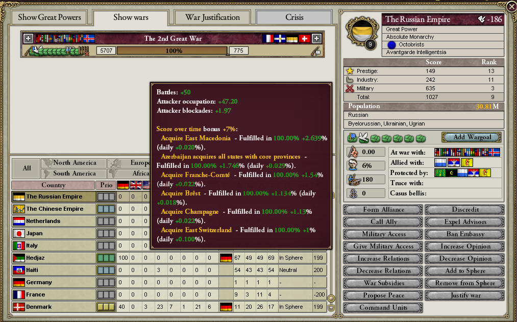 ふふふ。大戦でもWargoalを1/3のInfamyで増やすことはできたけど、世界大戦ではそれがWarScoreが50%を超えると簡単に追加できて、なおかつ必要なWarScoreも30%になるのだ。フランスとロシアから領土を奪い放題なわけ……!