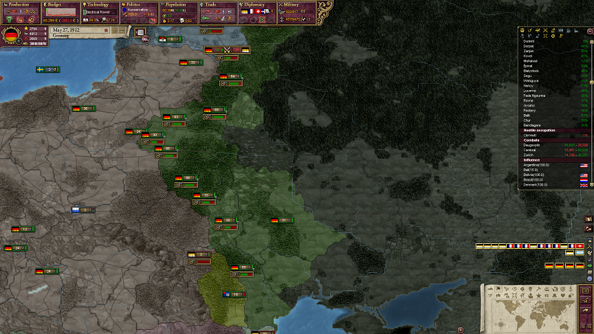 まぁ、やっぱり人口多い地域を取らないとねえ。ウクライナの独立も考えたんだけど、ドイツの領土にコアプロビがあるんでね~。あと、フランス方面はなんとパリの隣がもうドイツ領だ。フランス人にとっては屈辱的すぎる……。