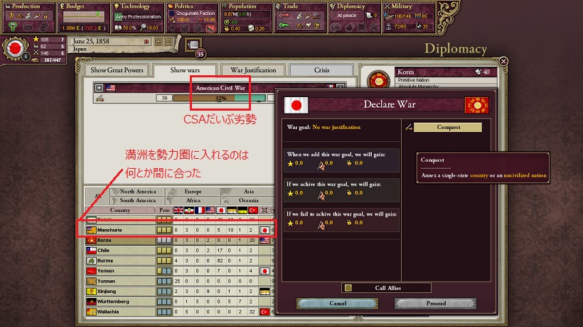 満洲を勢力圏に入れるのは間に合いましたが、思った以上にアメリカ連合国CSAは苦戦しているようです。