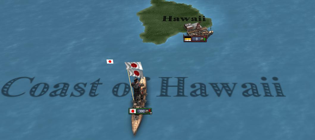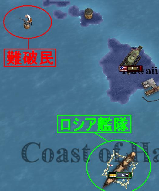 私はこの要請に応じ、艦隊を漂流予想海域へ向かうよう指揮した。 運良く彼を救助できた我々は、一隻の輸送艦に彼を乗せ、無事に島へ送り届けるよう主計長ポニャトフスキに命令した。 時待たずして、救助の為のアメリカ艦隊がお出ましになったが、何を勘違いしたのかメリケン共は我々を砲撃してきたのだ。 再三砲撃停止要請を行ったもの、旗艦内に英語を喋れる者が居なかった事も祟って、一向に止む気配はない。