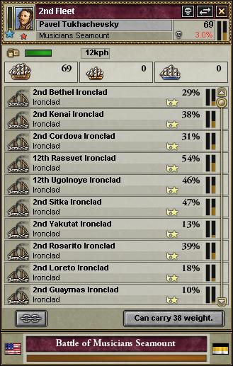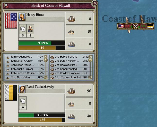 仕方なく我々は奴等を片付ける他なくなり、私は全艦に攻撃命令を下した。そう、仕方なくだ! 三日三晩砲撃を行った結果、あのバカな艦隊共は海へ消え去った、ざまぁみろだ。 「救助したアメリカ人を下ろすついでに、我々も下ろせ」と煩かった貴族どもを止む無く上陸の許可を出したが、本国に帰れば大目玉を食らうに違いない。 ≪トハチェフスキ航海日誌 17日目 ワレ米艦隊撃破ニ成功セリ より≫