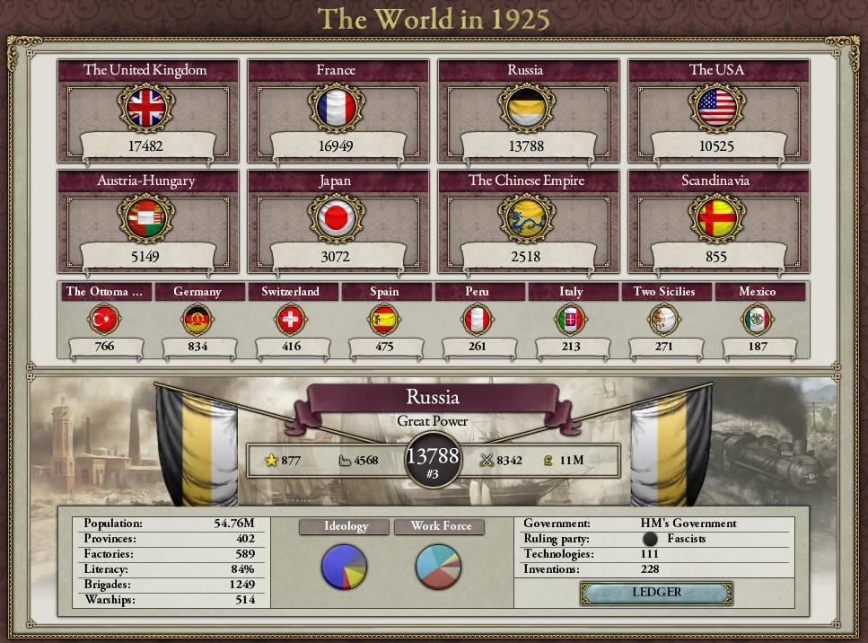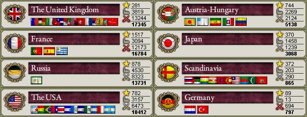 英 師団数:1274 艦艇数:1924 | 仏 師団数:1433 艦艇数:2542 | 露 師団数:1249 艦艇数:755 米 師団数:543 艦艇数:1843 | 墺 師団数:467 艦艇数:726 | 日 師団数:364 艦艇数:800 英 人口:80.07M 威信点:281 工業点:3837 軍事点:13369 | 仏 人口:56.00M 威信点:1523 工業点:3105 軍事点:12315 露 人口:54.76M 威信点:877 工業点:4568 軍事点:8342 | 米 人口:30.61M 威信点:783 工業点:3170 軍事点:6572 墺 人口:21.11M 威信点:744 工業点:2277 軍事点:2127 | 日 人口:19.48M 威信点:355 工業点:1463 軍事点:1253