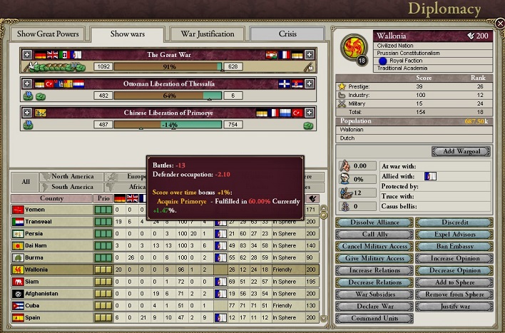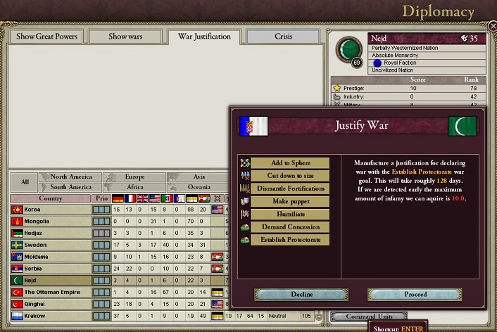 将軍「いや、実はここでつくっているCB、Establish Protectorateは列強だとわりと大きい非文明国を保護領化できるが、列強でなければ条件が厳しい。いまがいい頃合いなのだ」