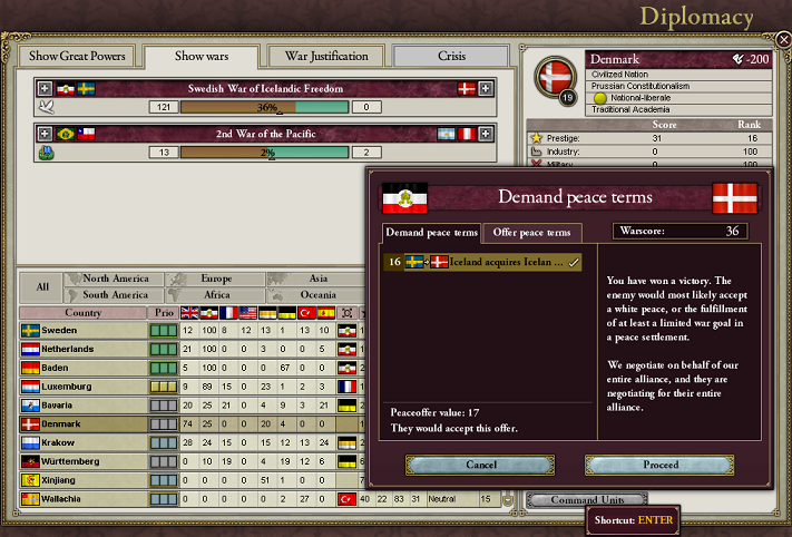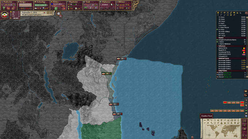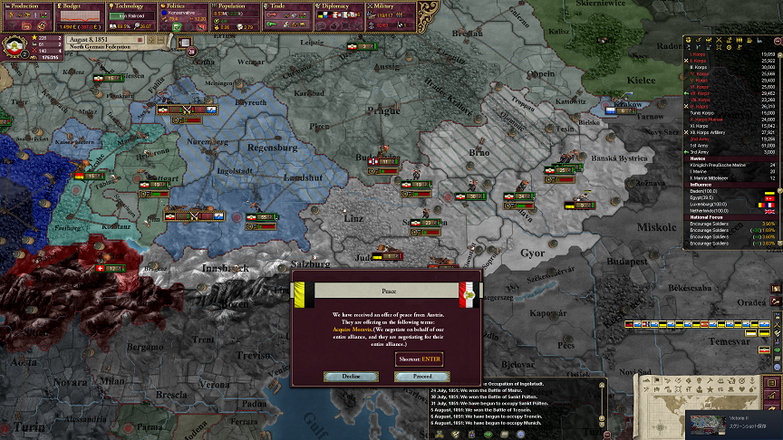 勢力圏に入れておくと参戦してこないんだよね。バイエルンとヴュルテンベルクは交戦国になっちゃったから和平期間は影響をかけられなくなっちゃった。まぁ、次の機会に狙えばいいけどね。