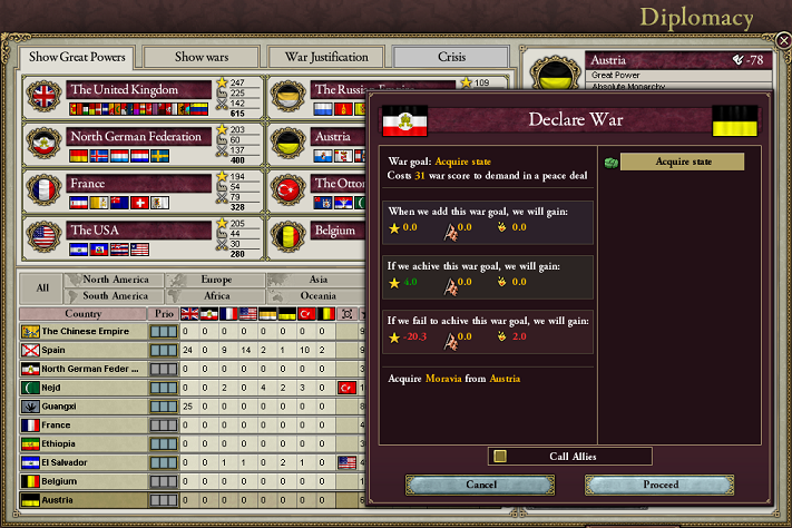 オーストリア側に同盟国が増えなければね。でも、増えないだろうな。フランスとはイタリアで対立しているし、ロシア、トルコとも仲良くはないだろうしね。まぁ、ロシア、トルコぐらいならなんとかなるだろうし。
