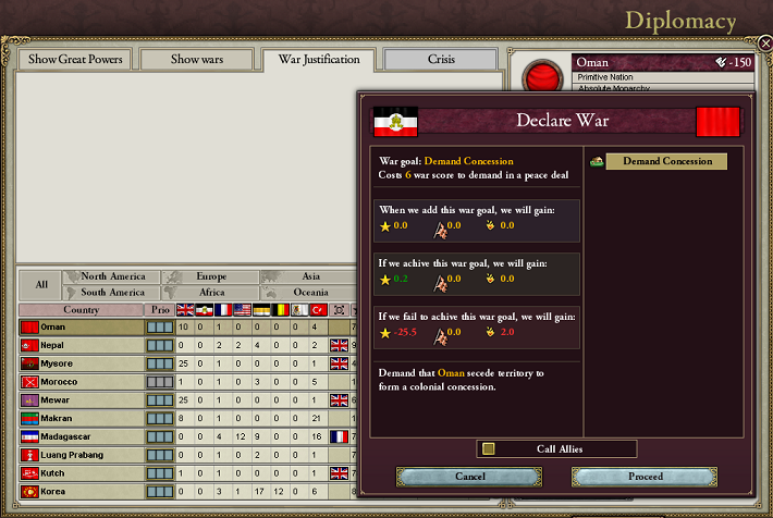ほら、前に話したでしょ。戦争で防衛側の国の影響がFriendly以上なら列強は現状維持のCBで参戦できるって。