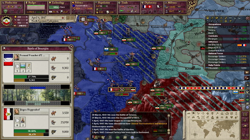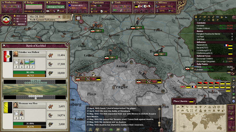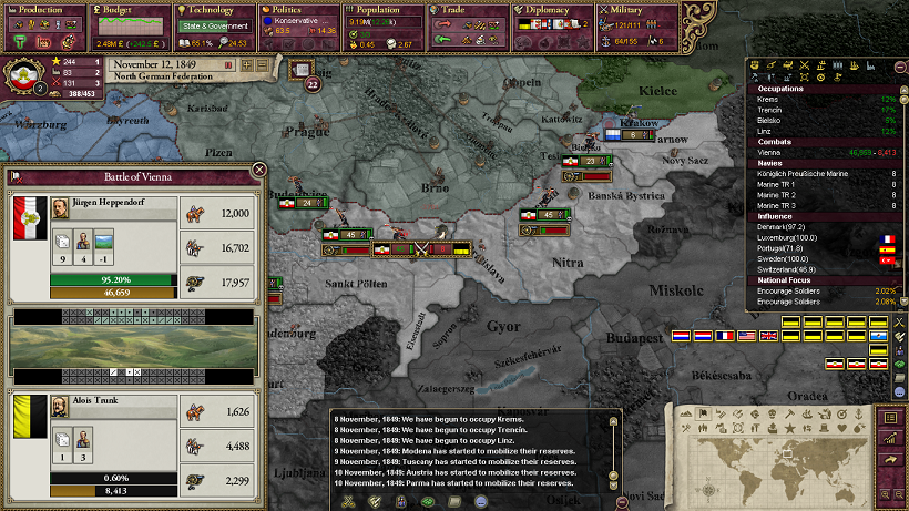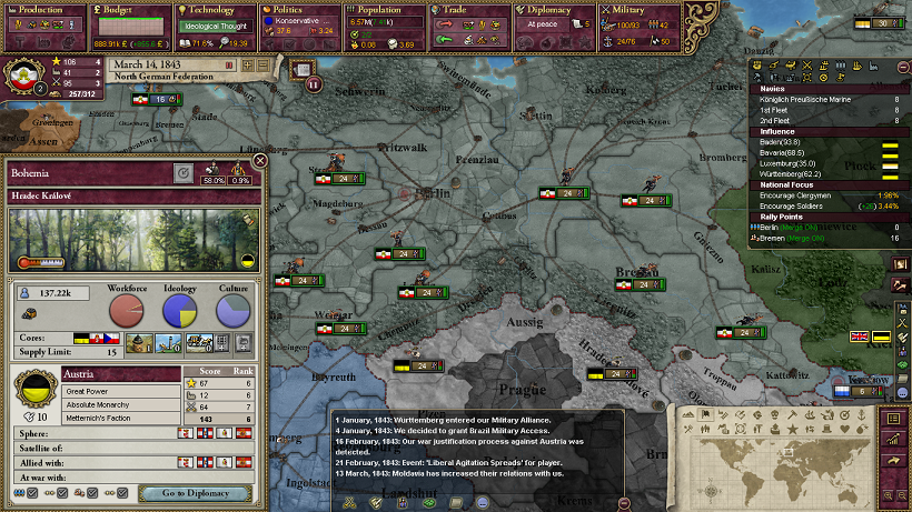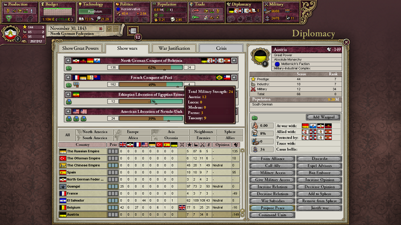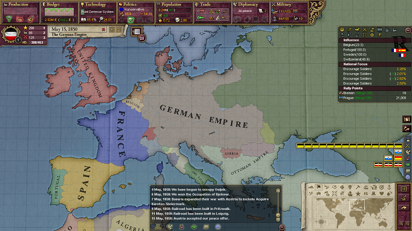 実際に1840年代にオーストリアと2回戦争するとすると、1840-1年ぐらいにバイエルン・バーデンを勢力圏に入れて最初の戦争をして、1847年までにAdd to SphereのCBを作成しつつヴュルテンベルクを勢力圏に入れて、オーストリアと戦争する感じでしょうか。