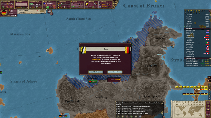 ブルネイは併合しても軍港増えるわけじゃないから最終的にはリリースでいいけどね。