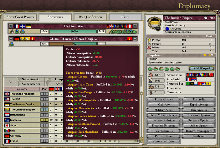んー。WarScore50からがキツイんだよね。占領が必要になってくるから。それに、露仏はまだ710も戦力を持ってる。どこに隠してるんだろ、マダガスカル?