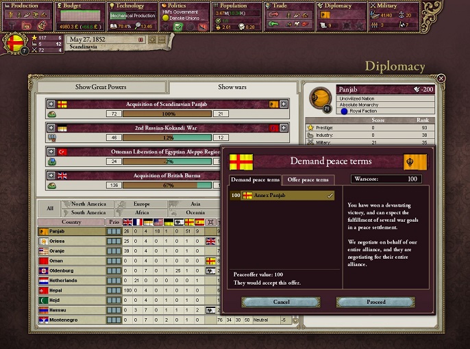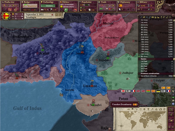 1854年、勢力圏に入れていたオマーンから援軍要請。そしてポルトガルから入植用植民地を奪う。一瞬BBR25を突破してしまったが、リセットとカシミール独立で乗り切った。