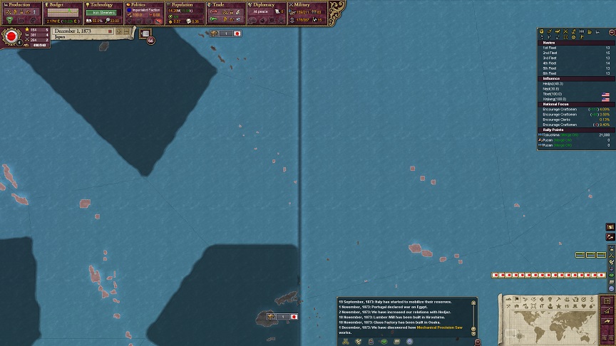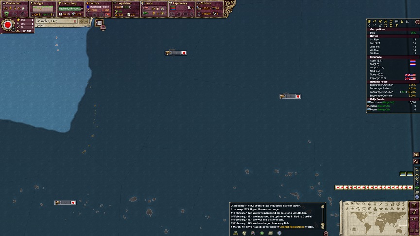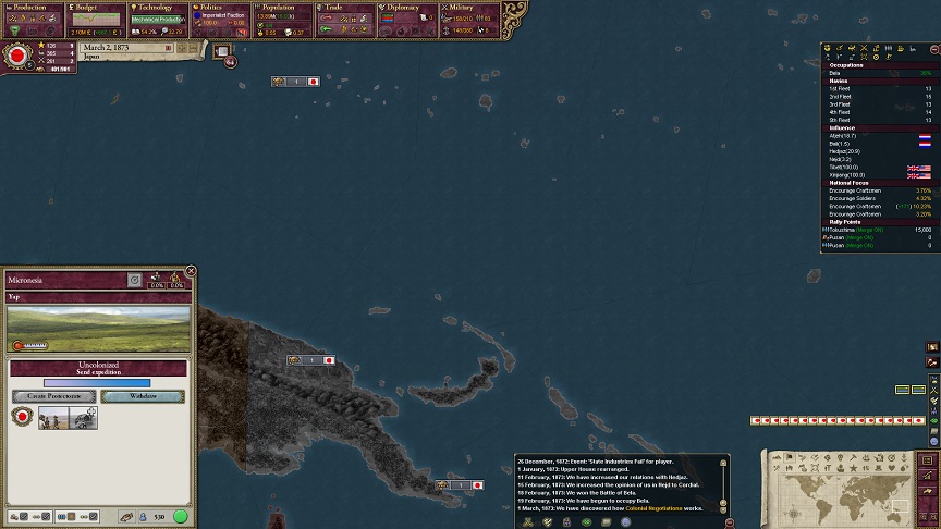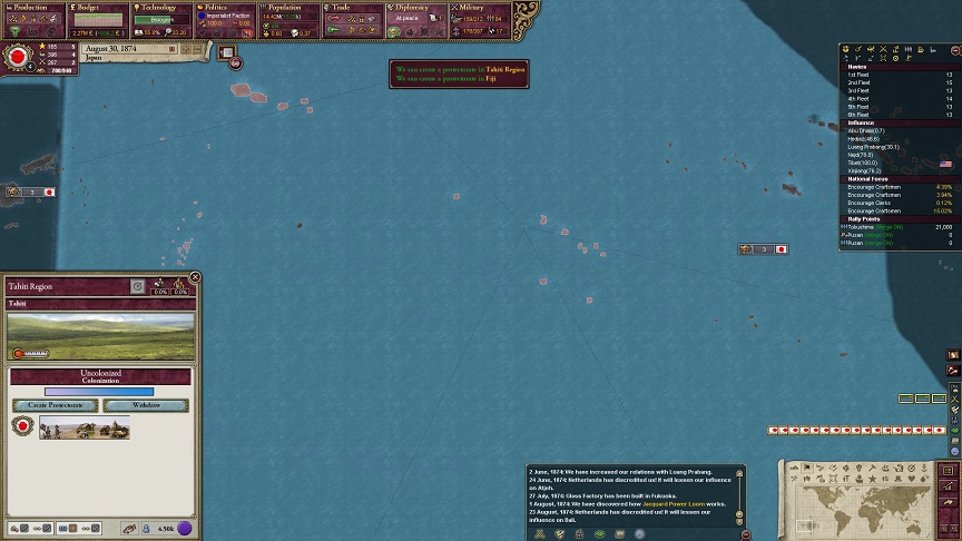 ザビエル「おめでとーございます。Nothern NewGuinea以外の初期植民ステートにおいて植民が軌道に乗りました。Southen NewGuinea、North Borneo、Micronesia、Bonin Islands、Hawaiian Islands、Tonga Regionが日本の領土に加わりました」