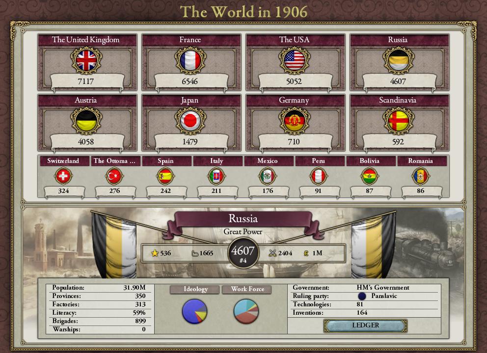 英 人口:85.19M 威信点:662 工業点:2439 軍事点:4015 | 仏 人口:17.36M 威信点:1123 工業点:1563 軍事点:3861 米 人口:20.99M 威信点:852 工業点:2310 軍事点:1890 | 露 人口:31.90M 威信点:536 工業点:1666 軍事点:2405 墺 人口:22.72M 威信点:574 工業点:1741 軍事点:1743 | 日 人口:13.81M 威信点:188 工業点:653 軍事点:638