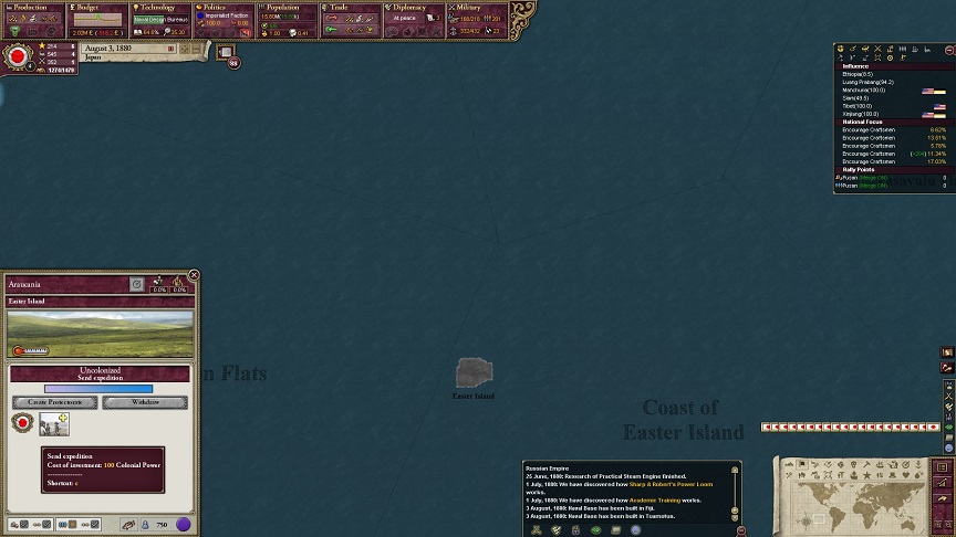 ザビエル「おめでとーございます。Nothern NewGuinea以外の初期植民ステートにおいて植民が軌道に乗りました。Southen NewGuinea、North Borneo、Micronesia、Bonin Islands、Hawaiian Islands、Tonga Regionが日本の領土に加わりました」
