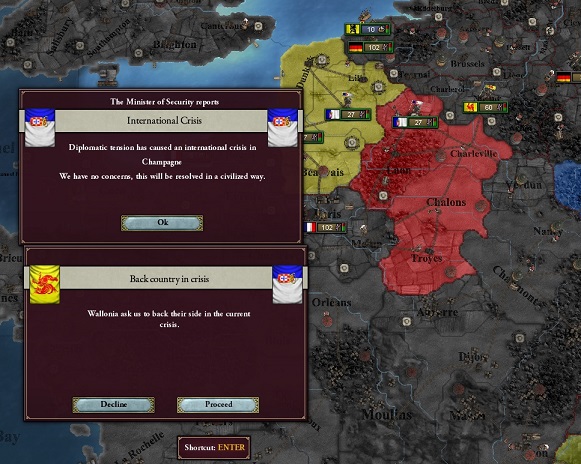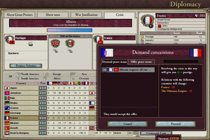 将軍「今回の危機は攻撃側なので結構キツいんだ。まず、少なくともWarScoreがアルバニア要求ステート分が最低かかる。次にいま和平期間中だから、わが国のほとんどすべての同盟国が参戦しない…防御側なら参戦してくれると思うんだが」
