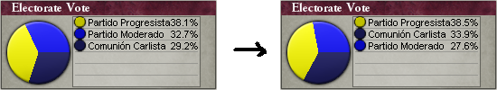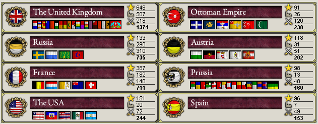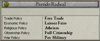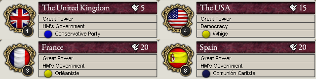 それから、立憲君主制および民主制の列強での与党第1党だが、英国は保守党、フランスは自由主義者のオルレアン派(Orleaniste)、USAは自由主義者のホイッグ党(Whigs)、スペインは反動主義者のコミュニオンカルリスタ(Comunion Carlista)だ。