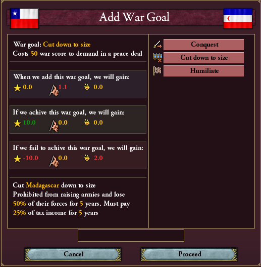 それでは、宣戦布告します。戦争の目的は、マダガスカルはMahajanga(マハジャンガ)州とAmpanihy(アンパニヒ)州からなる2ステート国家なのでConquest(征服)ですか?