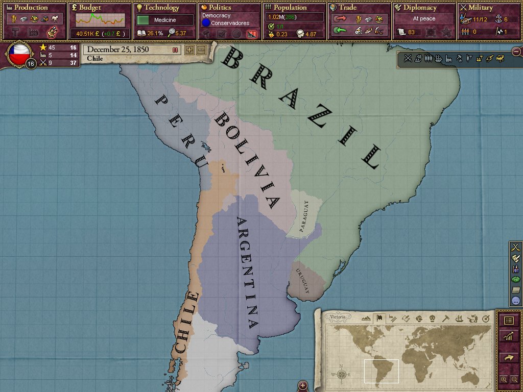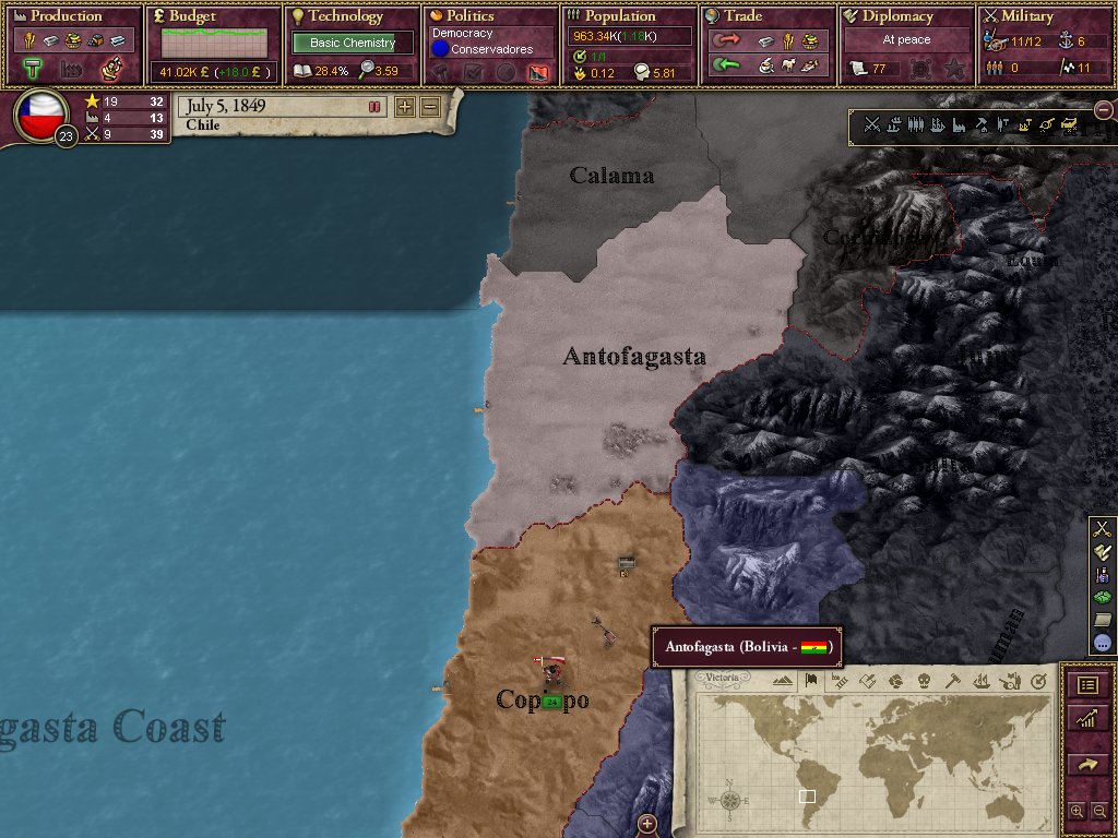 12月24日、ボリビアは、軍縮と賠償金支払い及びポトシ州の割譲という我が国の和平提案を受け入れました。これにより、我が国の序列は16位となり、準列強となりました。新たに獲得したポトシ州では、鉄、穀物の他、羊毛も産出します。