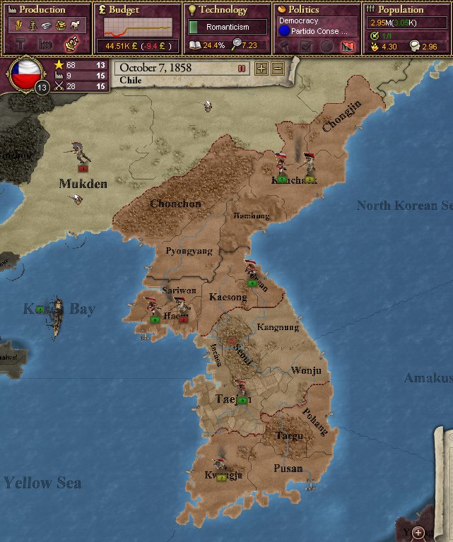 10月7日、朝鮮は、軍縮と賠償金支払い及びKwangju(光州)ステート、Pyongyang(平壌)ステート、Sariwon(沙里院)ステートの租界化という我が国の和平提案を受け入れました。現在、我が国の序列は13位です。獲得した光州ステート、平壌ステート、沙里院ステートでは、穀物、鉄の他、木材、石炭を産出します。