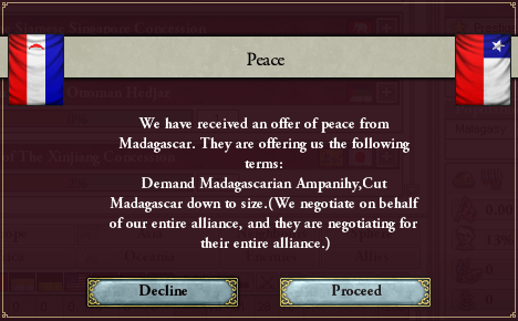 い、いいえ、なんでもありません。11月17日、マダガスカルは、軍縮と賠償金支払い及びアンパニヒ州の租界化という我が国の和平提案を受け入れました。新たに獲得したマダガスカルのアンパニヒ州では、果物、穀物の他、石炭も産出します。